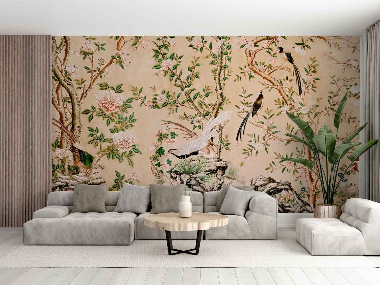 The mural showcases a stunning peacock amidst an intricate backdrop of tropical flora and architectural motifs. The texture is a tapestry-like weave of botanical elements and feathers, creating a harmonious pattern that invites viewers to discover its many details. The layers of flora and fauna interplay with ornate cages, dding depth and intrigue. The peacock’s detailed plumage, with its eye-catching patterns and subtle color shifts from teal to soft browns, draws the eye and adds a sense of luxury. To complement this mural, choose rich velvet textures, antique wooden elements, and brass or copper accents to create an ambiance of refined legance and historical charm.