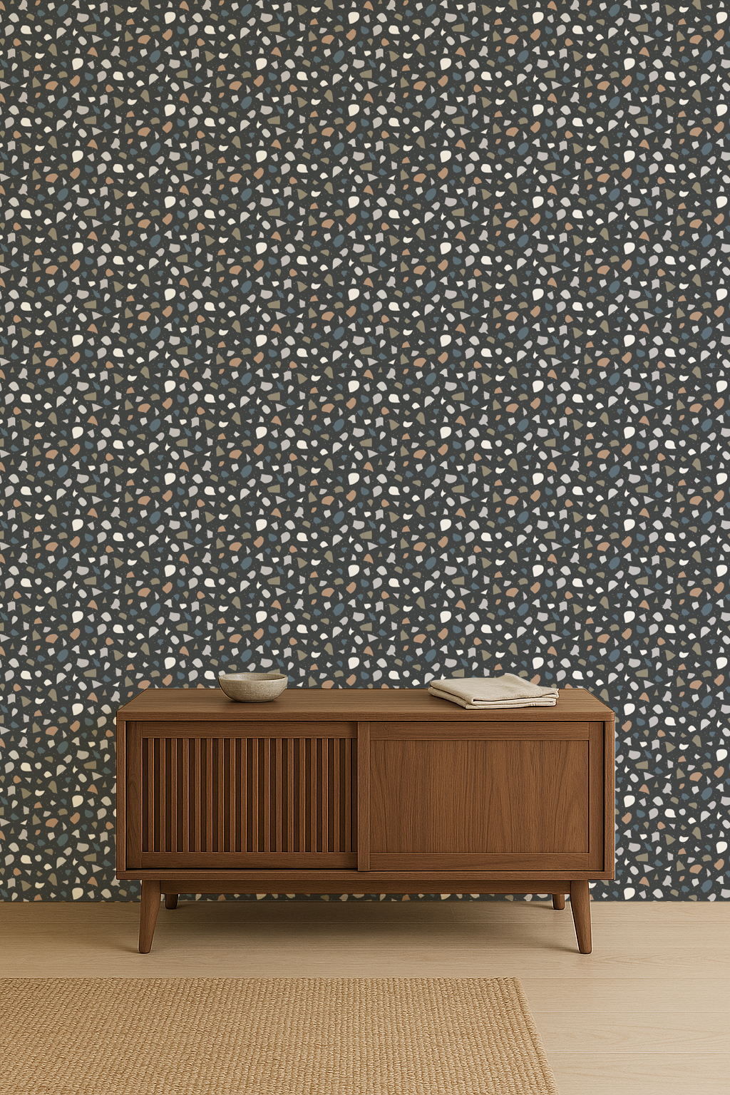 Warm terracotta, deep teal, and ivory fragments dance across white, creating a refined terrazzo aesthetic with Mediterranean-inspired elegance.