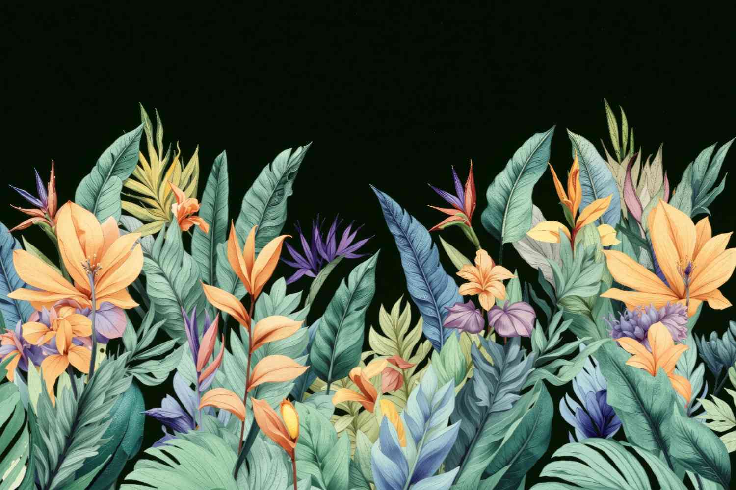 The mural showcases a stunning peacock amidst an intricate backdrop of tropical flora and architectural motifs. The texture is a tapestry-like weave of botanical elements and feathers, creating a harmonious pattern that invites viewers to discover its many details. The layers of flora and fauna interplay with ornate cages, dding depth and intrigue. The peacock’s detailed plumage, with its eye-catching patterns and subtle color shifts from teal to soft browns, draws the eye and adds a sense of luxury. To complement this mural, choose rich velvet textures, antique wooden elements, and brass or copper accents to create an ambiance of refined legance and historical charm.