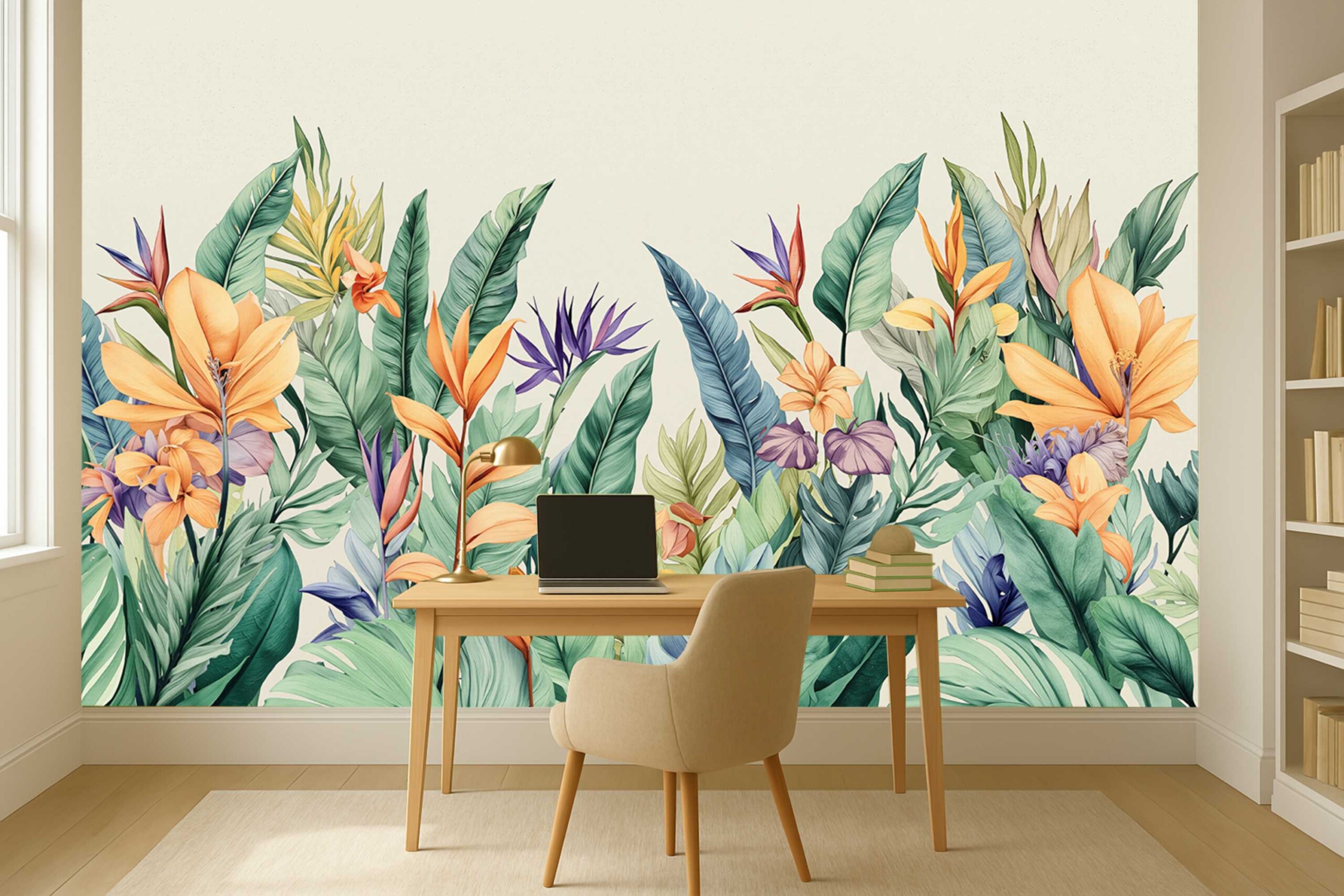 “Bamboo Whisper” evokes a sense of serene growth and gentle movement. This ultra-detailed mural reflects a watercolor art style, capturing the beauty of bamboo with subtle color variations and delicate brush strokes. The overlapping leaves and stems provide depth and texture, while the gentle hues convey a sense of eace.